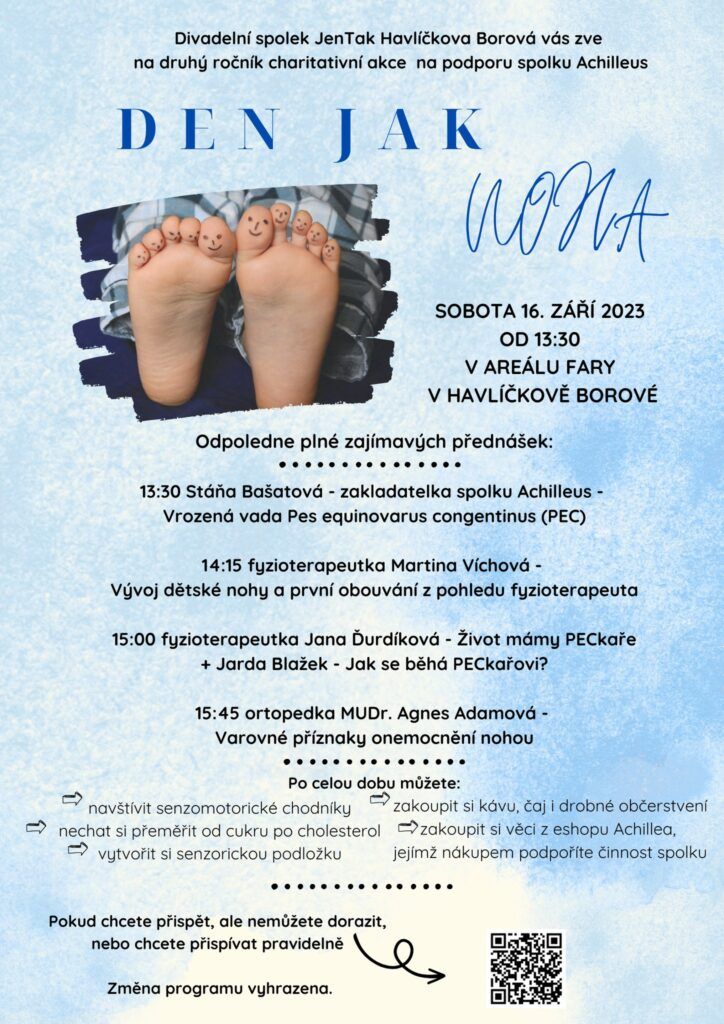 Chtěli bychom Vás pozvat na akci DEN JAK NOHA v Havlíčkově Borové v kraji Vysočina, necelých 22 km od Havlíčkova Brodu a necelých 18 km od Žďárů nad Sázavou. Jedná se o druhý ročník charitativní sbírky na podporu spolku Achilleus, s.z. Spojte příjemné s užitečným a užijte si pěkné odpoledne v areálu fary.